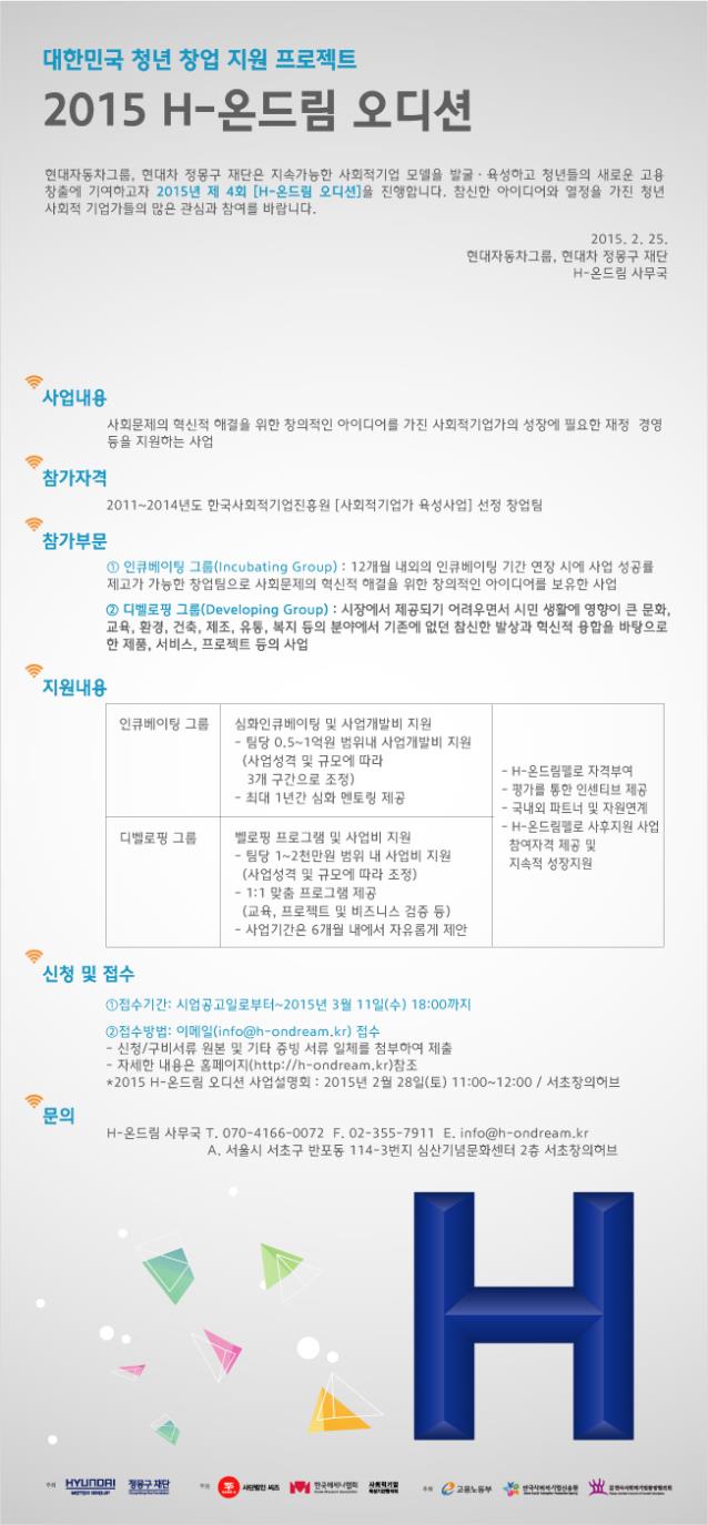 현대자동차그룹, 현대차 정몽구 재단 H-온드림 사무국에서 사회적기업 모델을 발굴, 육성하고 청년들의 새로운 고용 창출에 기여하고자 하는 2015년 제 4회 H-온드림 오디션을 진행한다고 합니다.