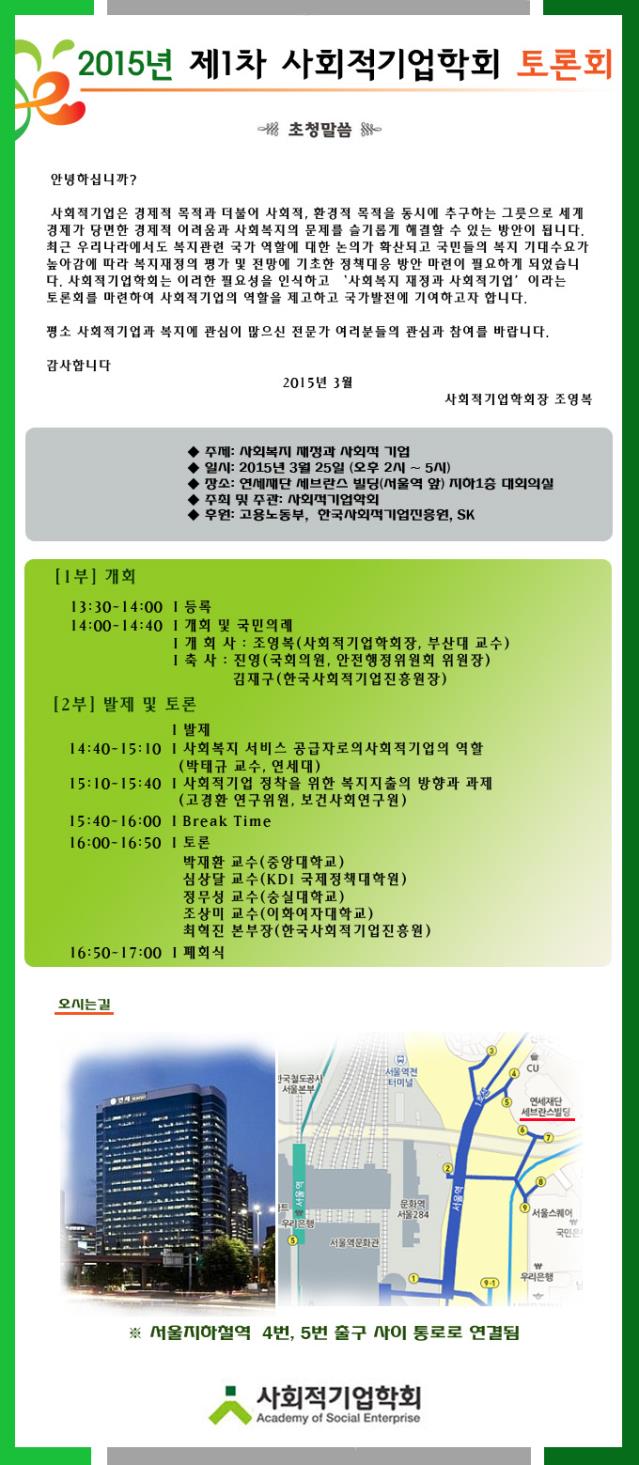 2015년 제1차 사회적기업학회 토론회가 개최됩니다.