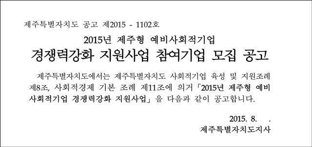 | 제목 | 2015년 제주형 예비사회적기업 경쟁력강화 지원사업 |