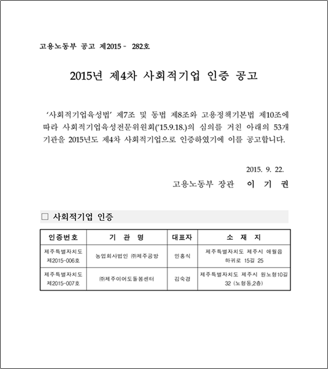 제4차 사회적기업 인증 심사 결과 제주에서 2곳의 인증 사회적기업이 탄생했습니다.