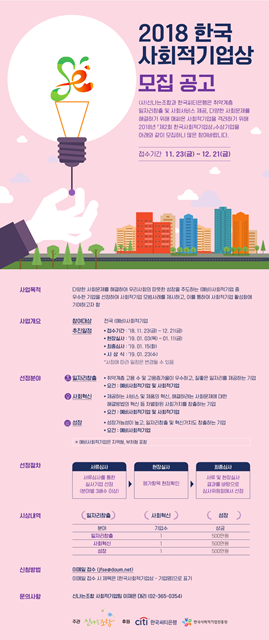 (사)신나는조합과 한국씨티은행은 취약계층 일자리창출 및 사회서비스 제공, 다양한 사회문제를 해결하기 위해 애써온 사회적기업을 격려하기 위해 제2회「2018년 한국사회적기업상」수상기업을 아래와 같이 모집하니 많은 참여바랍니다.