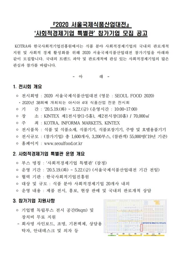 (공고) 2020 서울국제식품산업대전 '사회적경제기업 특별관' 참가기업 모집(~3.20)