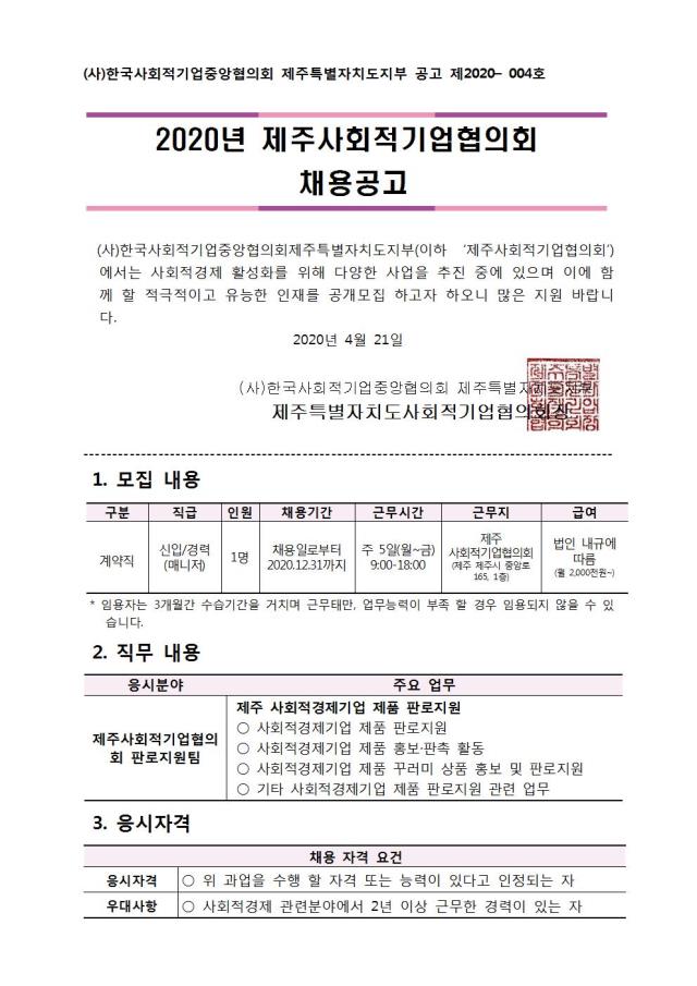 (공고) 제주사회적기업협의회 판로지원팀 채용 공고(~4.27)