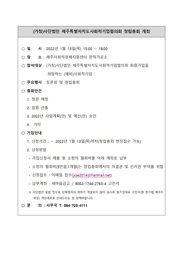 (가칭) 사단법인 제주특별자치도사회적기업협의회 창립총회 개최