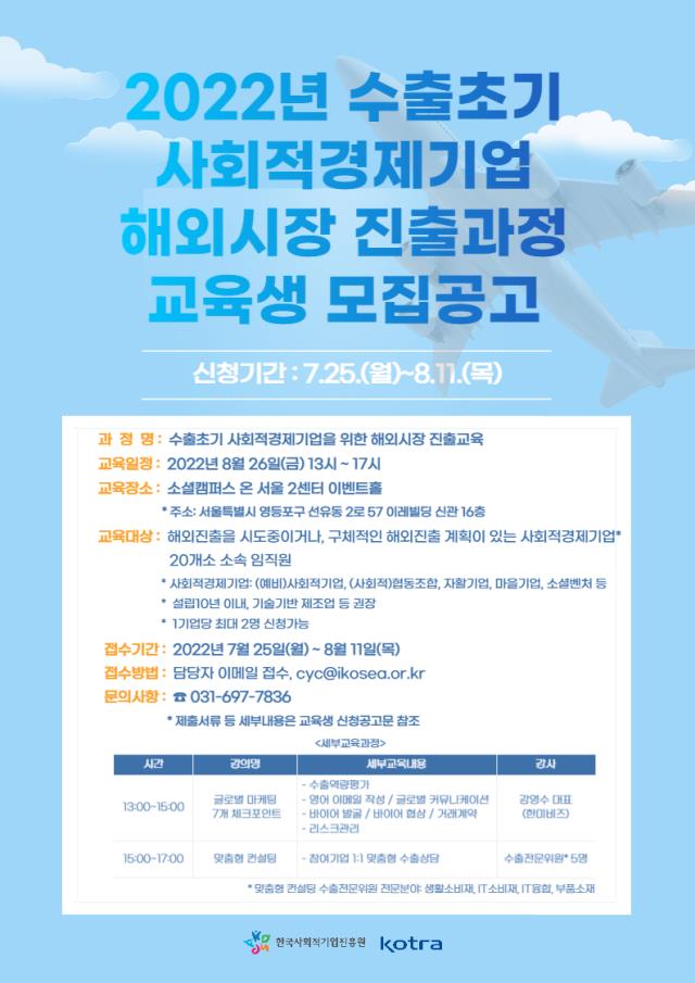 [공고] (kotra) 2022년 수출초기 사회적경제기업 해외시장 진출과정 교육생 모집공고(~8/11)