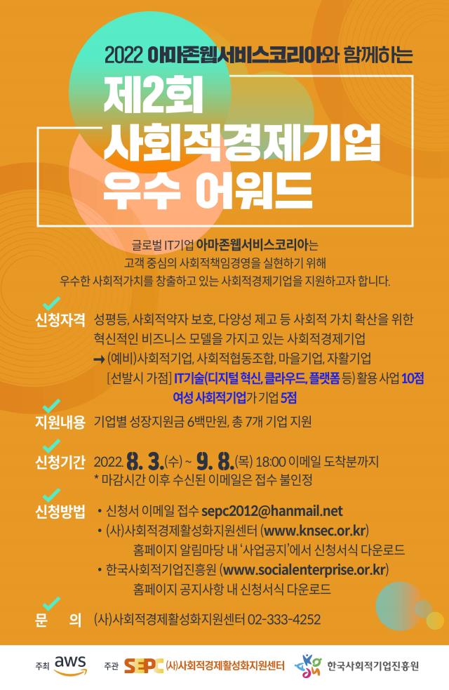 [알림] (아마존웹서비스코리아X한국사회적기업진흥원)제2회 사회적경제기업 우수 어워드 모집 공고(~9/8)