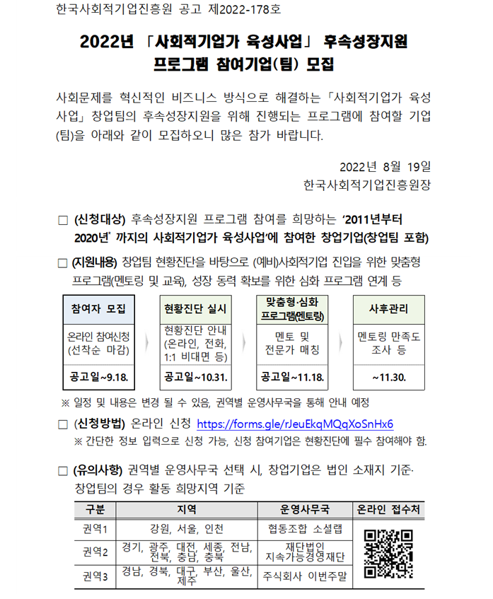 [공고] (한국사회적기업진흥원)2022년 「사회적기업가 육성사업」 후속성장지원 프로그램 참여기업(팀) 모집(~9/18)*선착순 마감