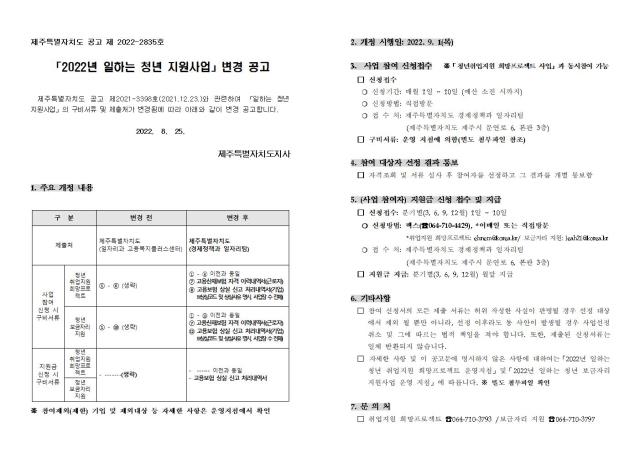 제주특별자치도 공고 제2021-3398호(2021.12.23.)와 관련하여 「일하는 청년 지원사업」의 구비서류 및 제출처가 변경됨에 따라 아래와 같이 변경 공고합니다.