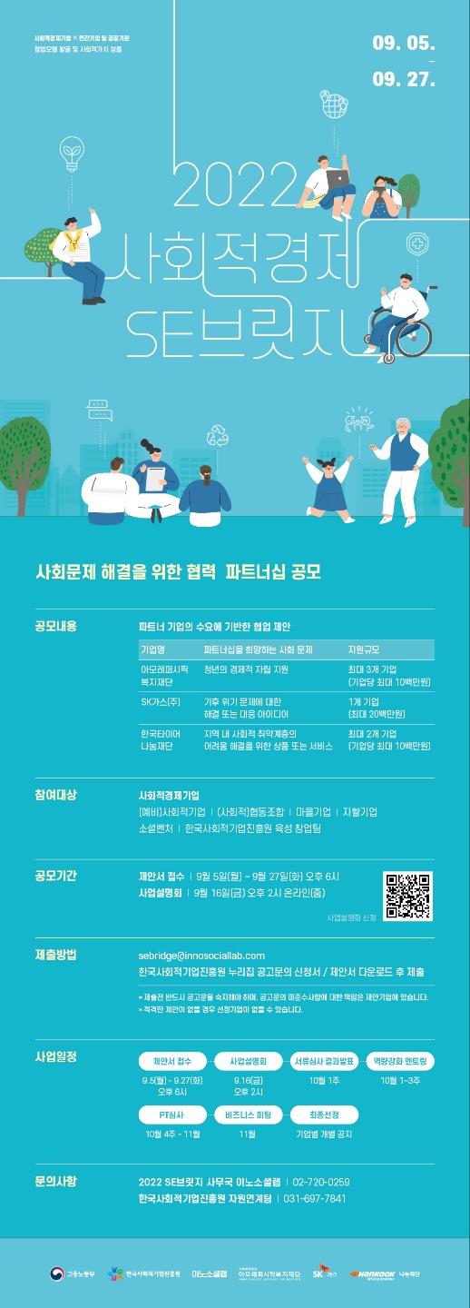 민간 기업과 사회적경제기업간 협업을 통한 사회문제 해결을 지원하기 위해 ‘22년 사회적경제 SE브릿지’ 참여 기업을 모집합니다.