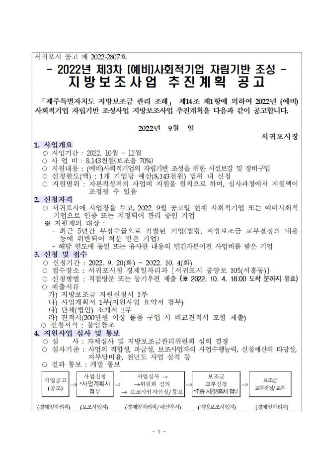 [공고] (서귀포시) 2022년 제3차 (예비)사회적기업 자립기반 조성사업 지원 계획 공고 (~10/4)
