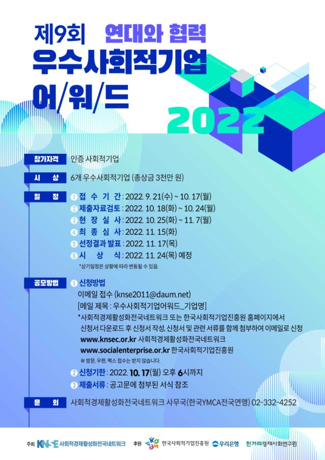 [공모] (한국사회적기업진흥원) 2022년 제9회 연대와 협력 우수사회적기업 어워드 (~10/17)