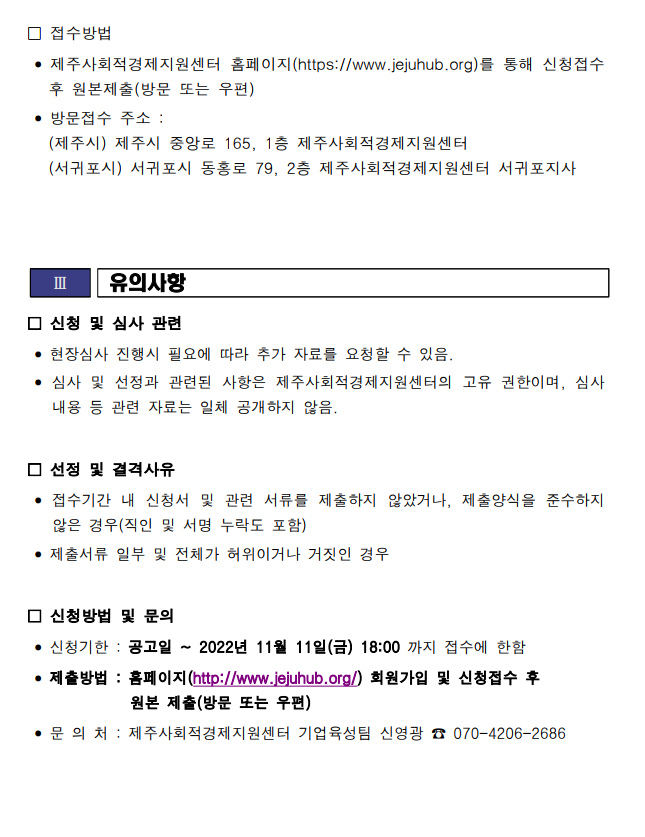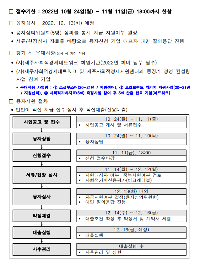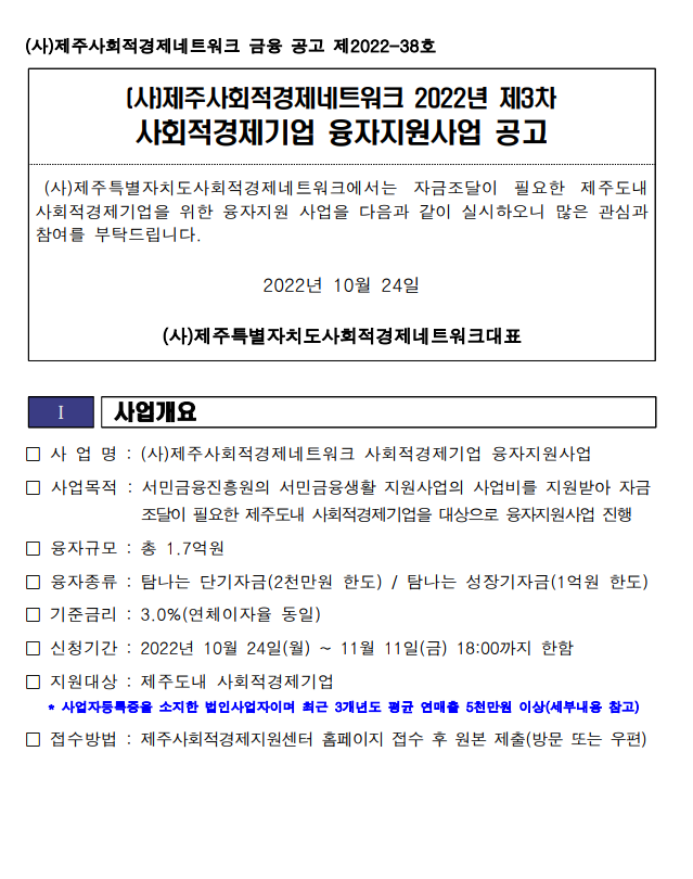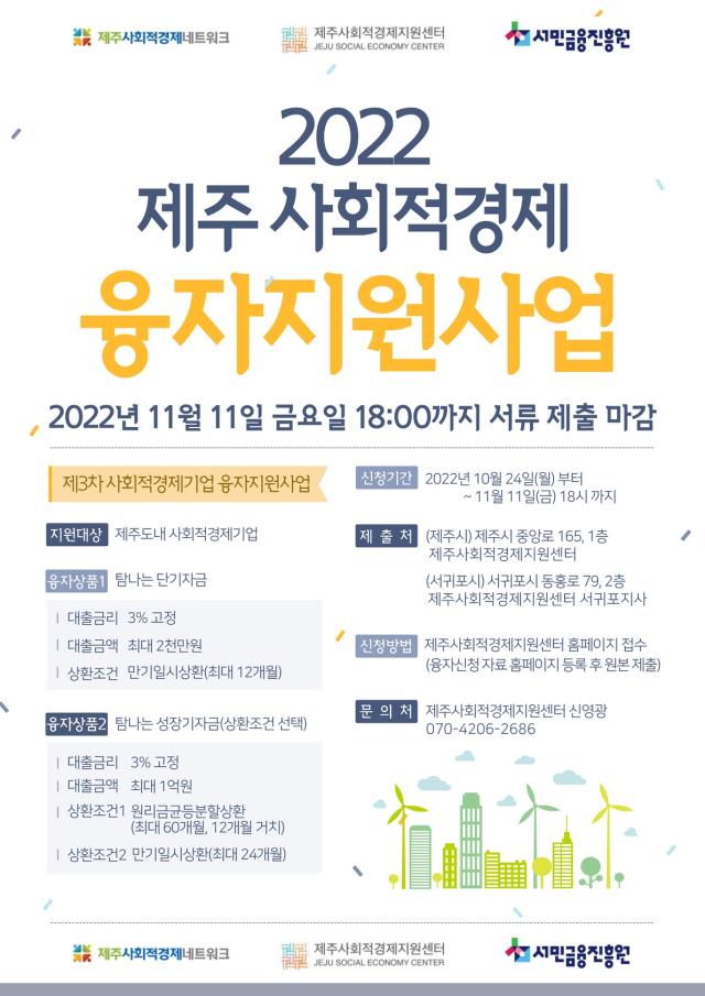 [공고] (제주사회적경제지원센터) 2022 사회적경제기업 융자사업 공고(3차) (~11/11)