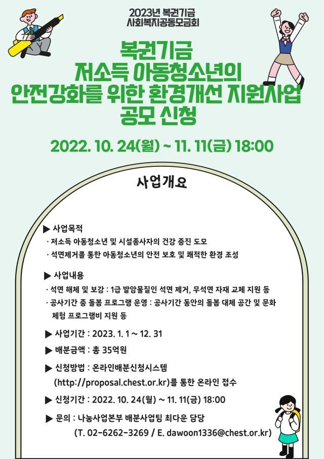 [공모] (사랑의열매) 2023년 복권기금 저소득 아동청소년의 안전강화를 위한 환경개선 지원사업 공모 (~11/11)