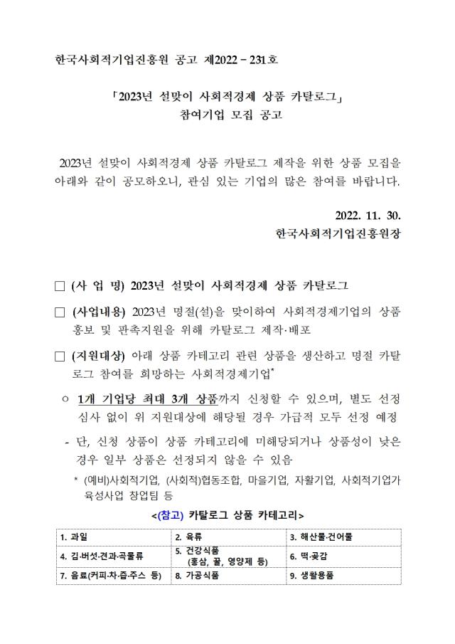 [공고] (한국사회적기업진흥원) 「2023년 설맞이 사회적경제 상품 카탈로그」 참여기업 모집 공고 (~12.9)