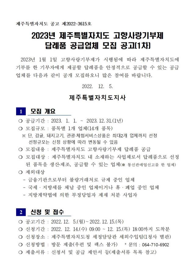 [공고] (제주특별자치도) 고향사랑기부제 답례품 공급업체 모집 공고 (~12.15)