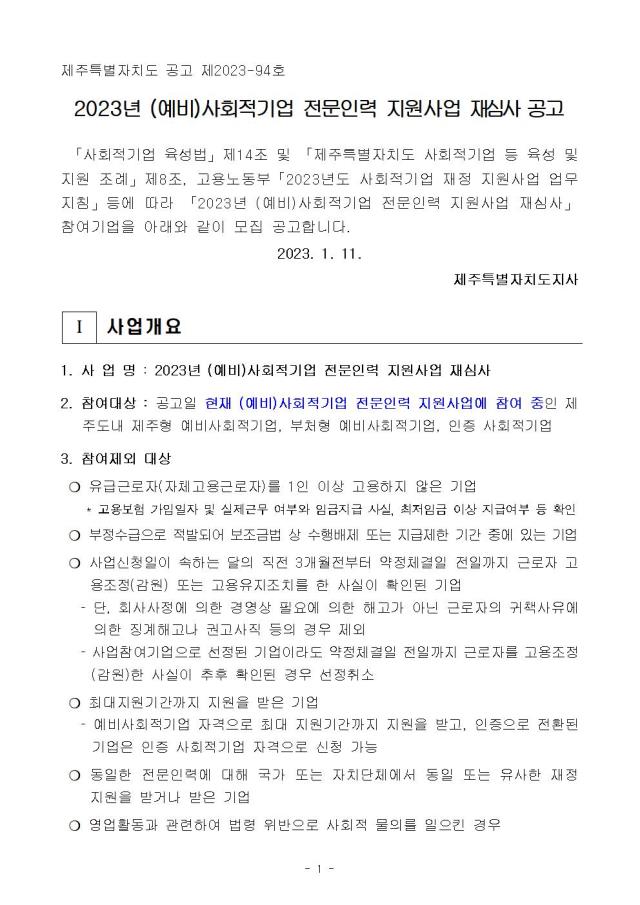 [공고] (제주특별자치도) 2023년 (예비)사회적기업 전문인력 지원사업 재심사 공고 (상시접수)