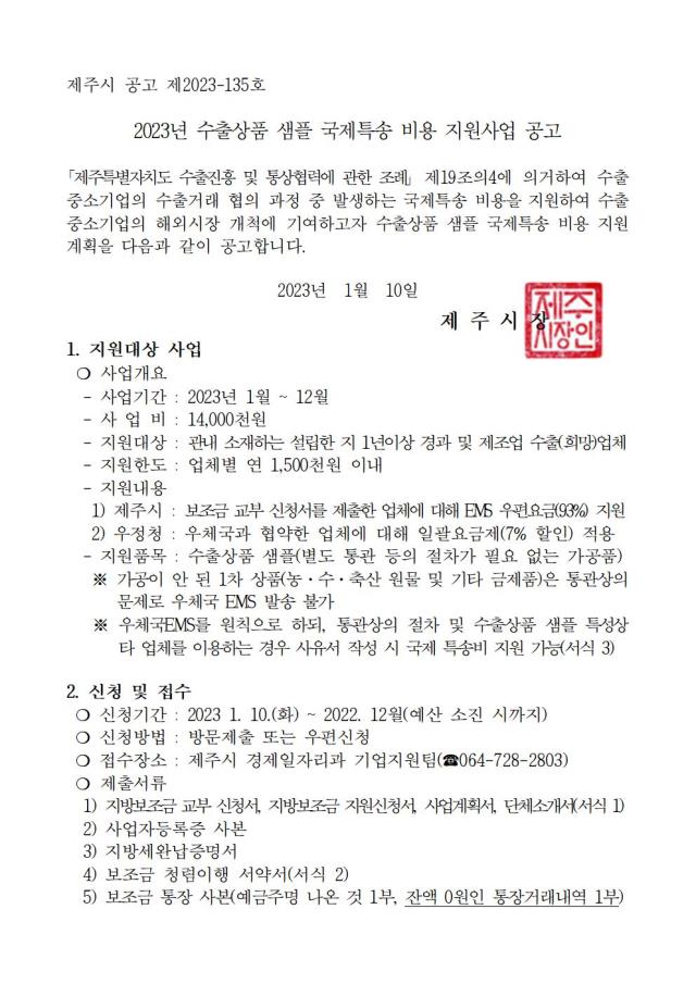 [공고] (제주시) 2023년 수출상품 샘플 국제특송 비용 지원사업 공고 (~예산 소진 시까지)