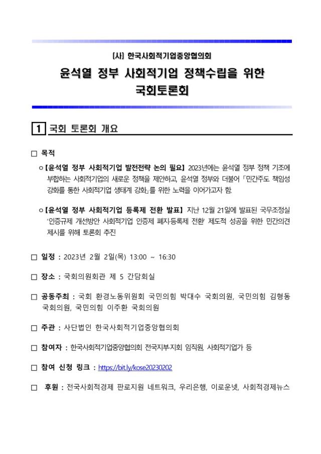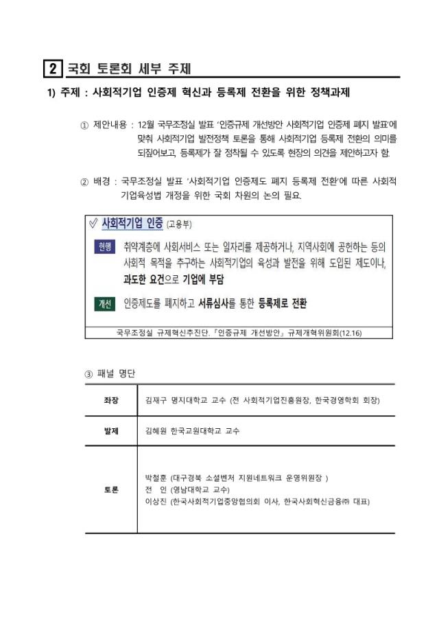 [공고] (한국사회적기업중앙협의회) 사회적기업 정책 수립을 위한 국회토론회 개최 (2.2)