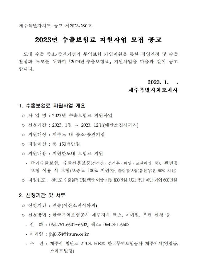 [공고] (제주특별자치도) 2023년 수출보험료 지원사업 모집 공고 (예산소진시 까지)