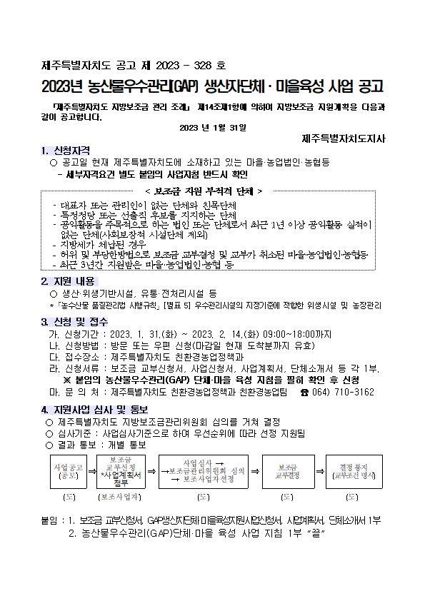 [공고] (제주특별자치도) 2023년 농산물우수관리(GAP) 생산자단체.마을 육성사업 공고 (~2.14)
