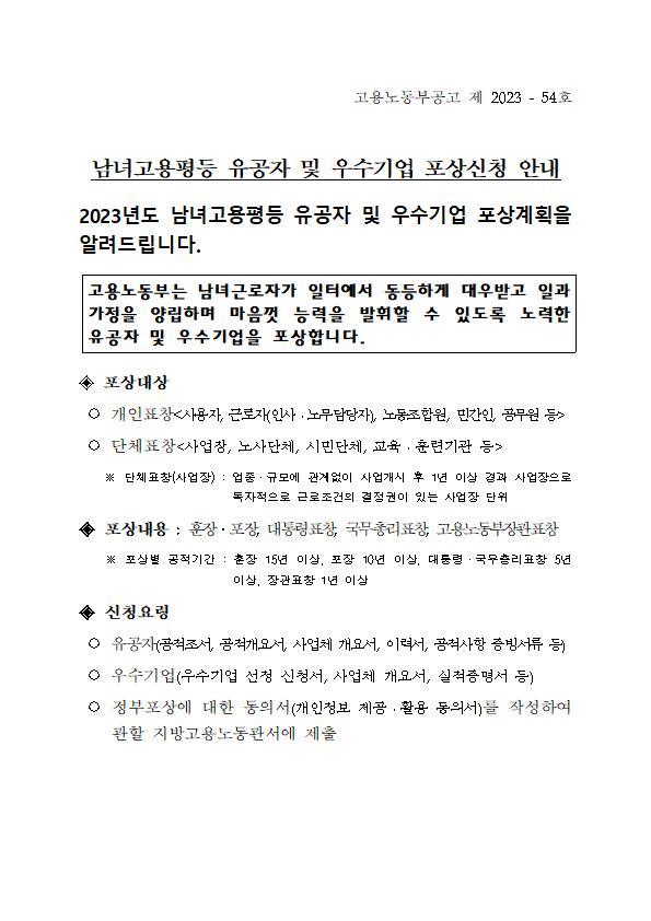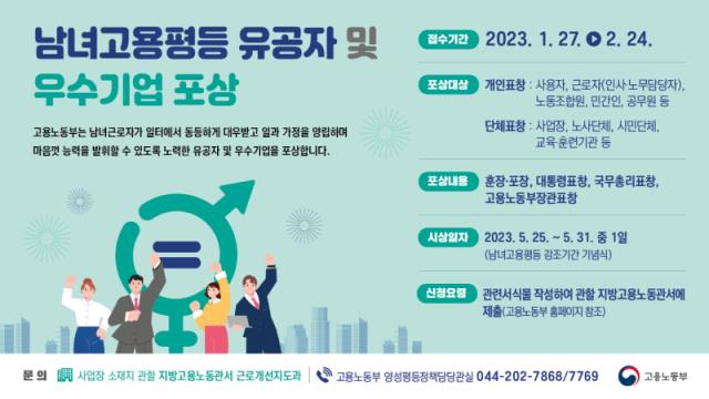 [공고] (고용노동부) 2023년 남녀고용평등 유공자 및 우수기업 포상 신청 안내 (~2.24)