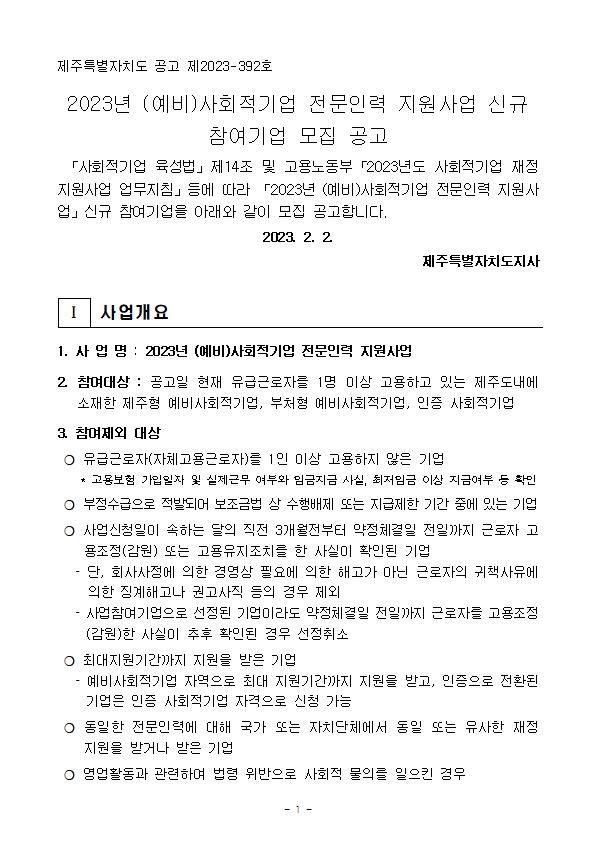 [공고] 제주특별자치도 2023년 (예비)사회적기업 전문인력 지원사업 신규참여기업 모집공고 (~2.21)