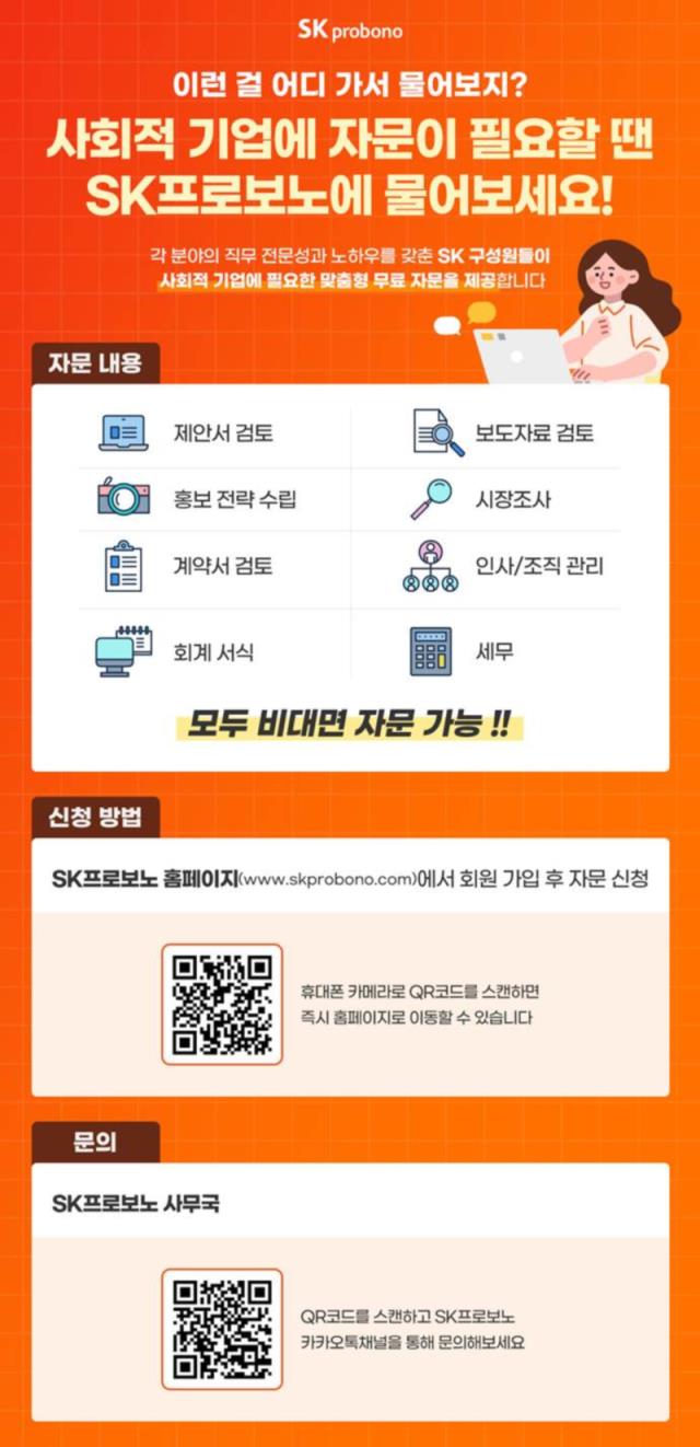 - 신청방법 : SK프로보노 홈페이지(https://www.skprobono.com/) 회원가입 후, 자문 신청