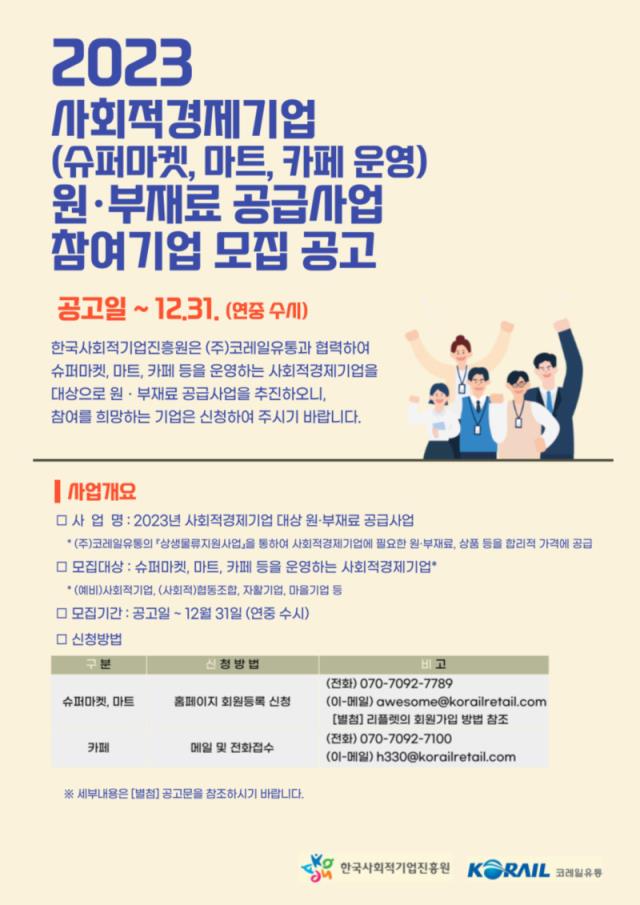[공고] (진흥원) 2023년 (주)코레일유통 사회적경제기업 원부재료 공급지원 참여기업 모집공고 (상시 모집)