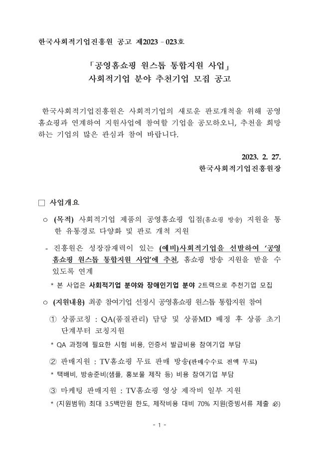 [공고] (한국사회적기업진흥원) '공영홈쇼핑 원스톱 통합지원 사업' 사회적기업 분야 추천기업 모집 공고(~3.10)