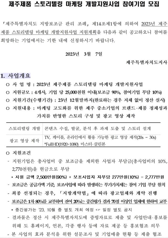 제주특별자치도_공고_제2022__836?__2023년도_제주제품_스토리텔링_마케팅_개발지원사업_참여기업_모집_수정_공고.hwp