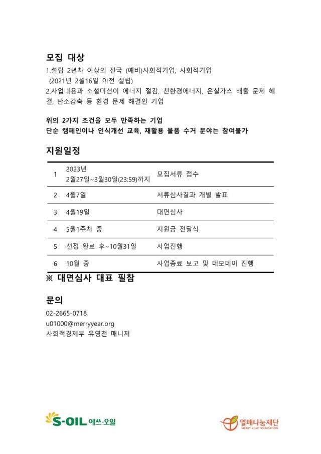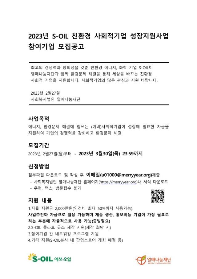 [공고] (열매나눔재단) 2023년 S-OIL친환경 사회적기업 성장지원사업 참여기업 모집공고(~3.30)