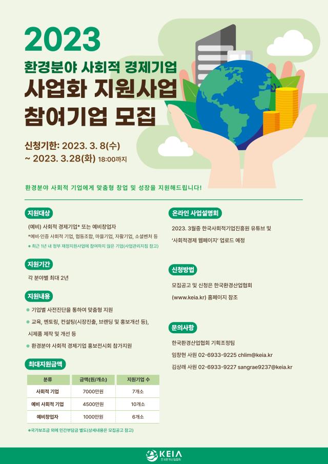 [공고] (한국환경산업협회) 2023년 환경분야 사회적경제기업 사업화 지원사업 (~3.28)