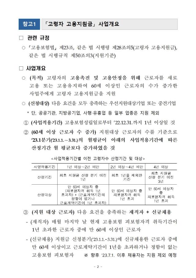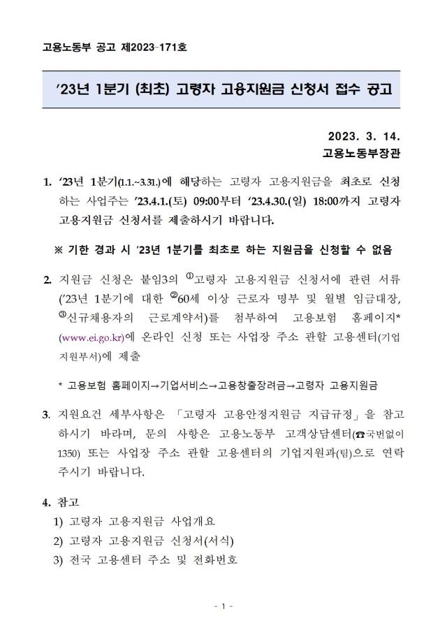 [공고] (고용노동부) ’23년 1분기 (최초) 고령자 고용지원금 신청서 접수 공고 (~4.30)