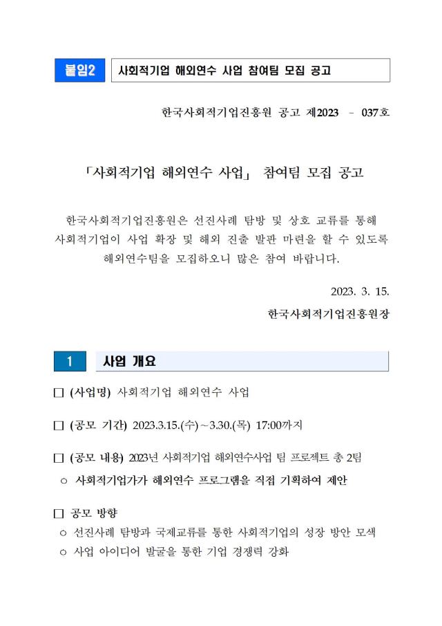 [공고] (한국사회적기업진흥원) 2023년 사회적기업 해외연수 참가팀 모집 공고 (~3.30)