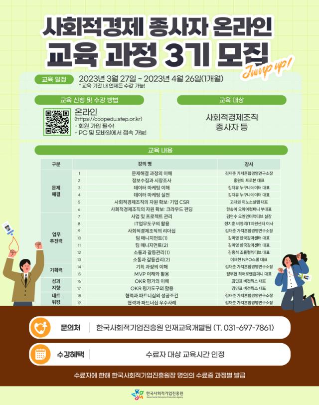 | 제목 | [안내] (한국사회적기업진흥원) 사회적경제 종사자 온라인 교육 과정 3기 모집 (~4.26) |