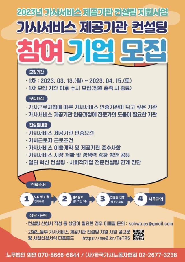 [공고] ((사)한국가사노동자협회) 2023년 가사서비스 제공기관 컨설팅 참여기업 모집 공고 (~4.15)