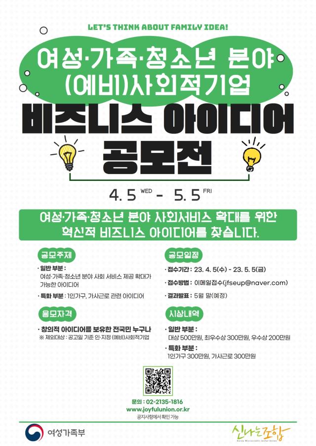 [공모] (신나는조합) 2023년 여성·가족·청소년 분야 (예비)사회적기업」 비즈니스 아이디어 공모전 (~5.5)