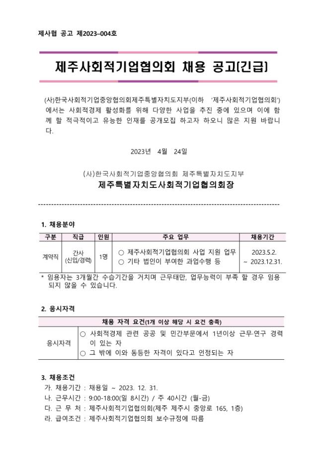 [긴급] (협의회) 제주사회적기업협의회 직원(신입/경력) 채용 공고 (~4.27)