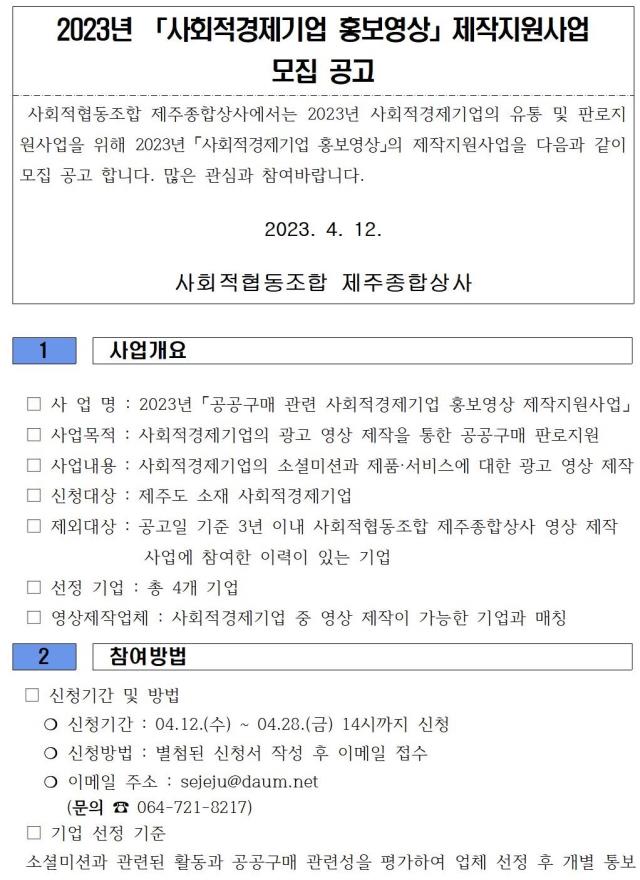 [공고] (사회적협동조합 제주종합상사) 2023년 사회적경제기업 홍보영상 제작지원사업 모집공고 (~4.28)