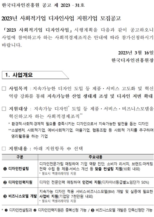 [공고] (한국디자인진흥원) 2023년 사회적기업 디자인사업 지원기업 모집공고 (~4.27)