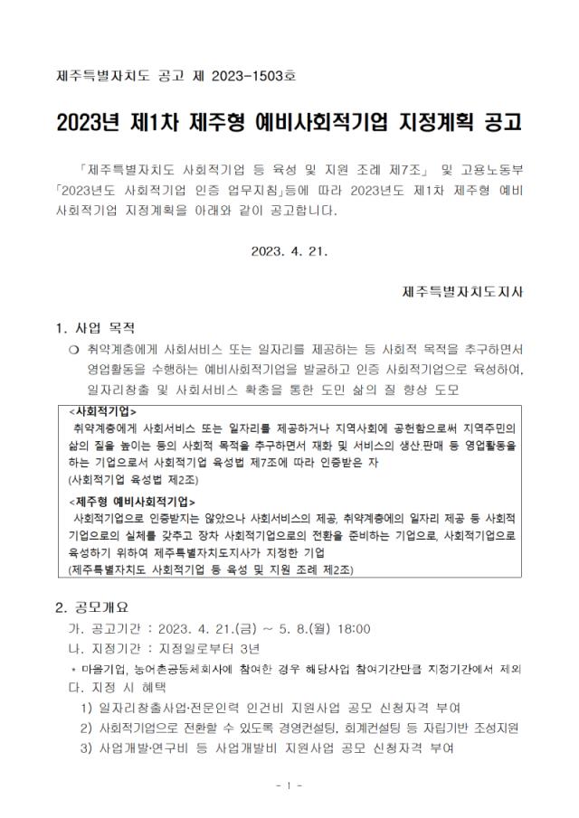 [공고] (제주특별자치도) 2023년 제1차 제주형 예비사회적기업 지정계획 공고 (~5.8)
