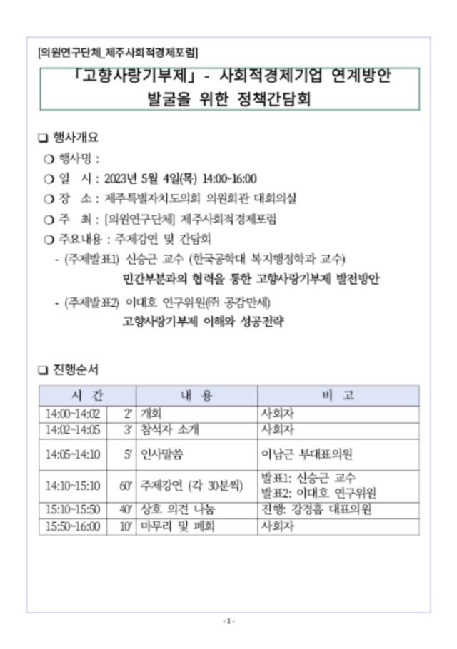 [안내] (제주특별자치도의원연구단체) 고향사랑기부제-사회적경제기업 연계방안 발굴을 위한 정책간담회 (5.4)