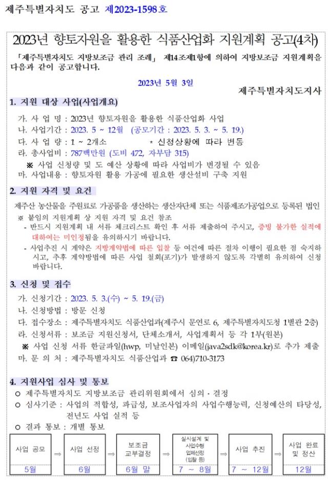 [공고] (제주특별자치도) 2023 향토자원을 활용한 식품산업화 지원사업 모집 공고(4차) (~5.19)