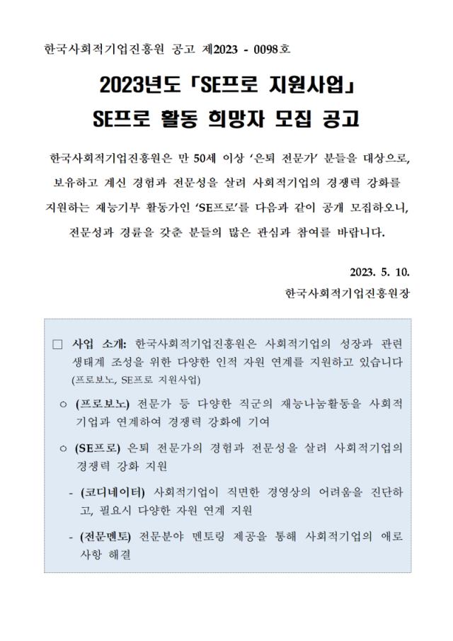 [공고] (한국사회적기업진흥원) 2023년 「SE프로 지원사업」 SE프로 활동 희망자 모집 (~5.25)