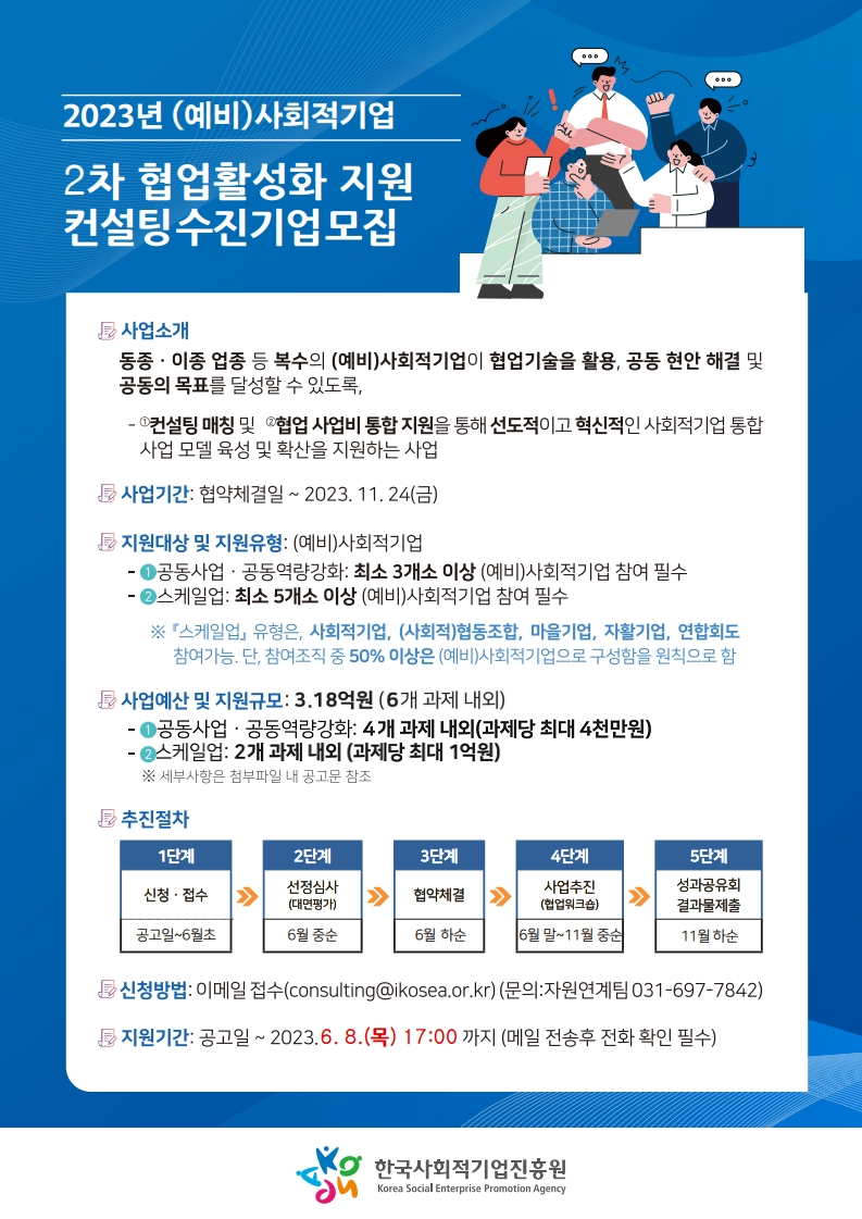 [공고] (한국사회적기업진흥원) 2023년 2차 (예비)사회적기업 협업활성화 지원컨설팅 수진기업 모집공고 (~6.8)