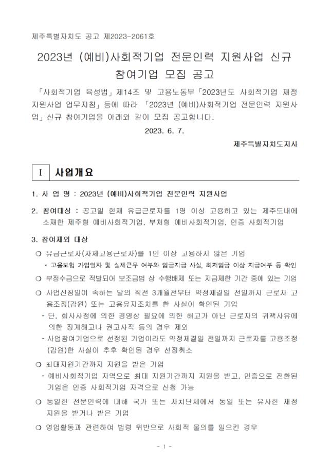 | 제목 | [공고] (제주특별자치도) 2023년 (예비)사회적기업 전문인력 지원사업 신규 참여기업 모집 공고(수정) (*서귀포시) (~6.21) |