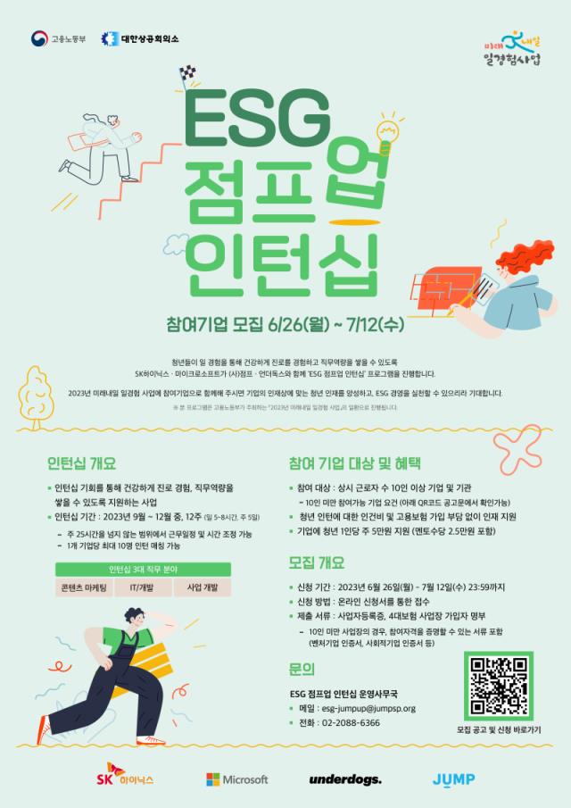 기업은 청년 인재를 지원받고, 청년들은 양질의 일경험을 쌓을 수 있는 고용노동부 주관 ‘2023년 미래내일 일경험 사업’ 중, 청년들이 사회적기업과 소셜벤처에서 일할 수 있도록 지원하는 『ESG 점프업 인턴십』 프로그램을 SK하이닉스, 마이크로소프트, 점프, 언더독스가 함께 하고 있습니다.