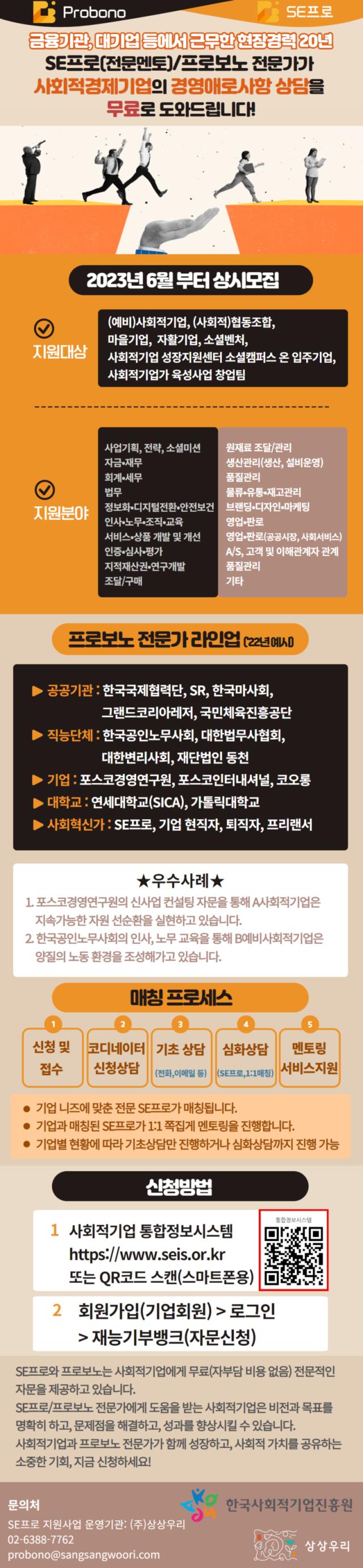 | 제목 | [공고] (상상우리) 2023년 'SE프로 지원사업' 참여기업(전문멘토, 프로보노 매칭 희망기업) 모집 (~9.30) |