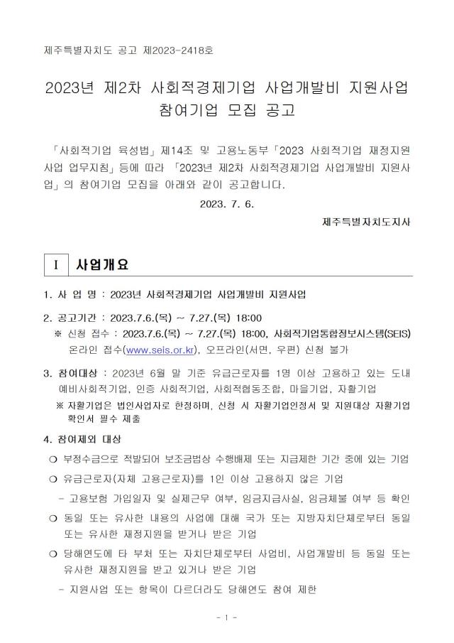 [공고] (제주특별자치도) 2023년도 제2차 사회적경제기업 사업개발비 지원사업 공고 (~7.27)