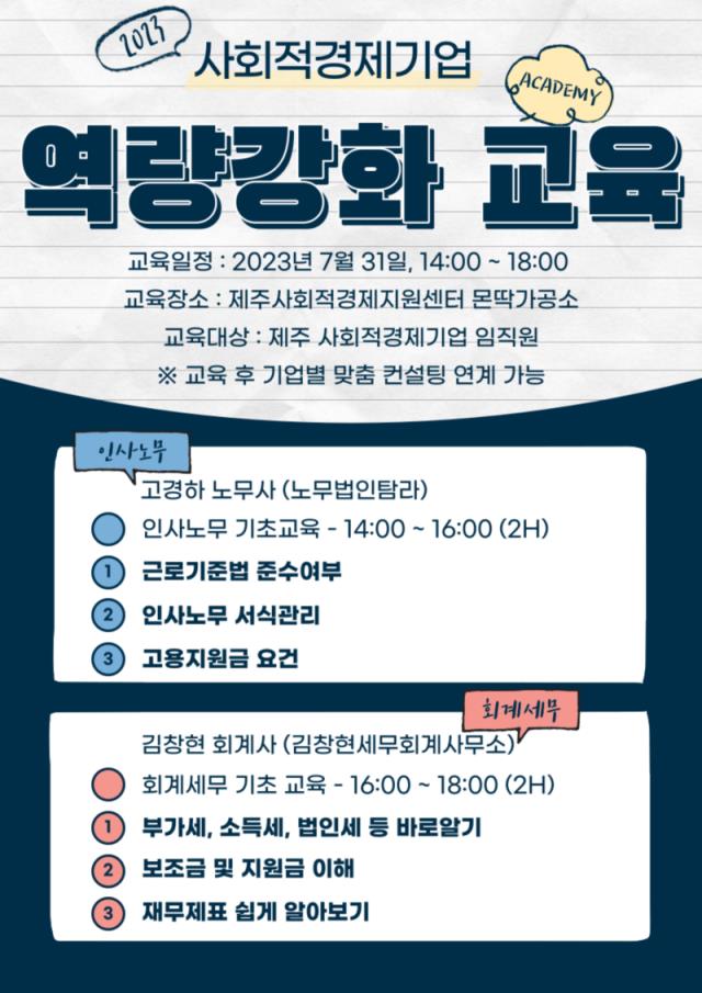 [알림] (협의회) 2023 사회적경제기업 실무역량 강화교육 <인사노무, 회계세무편> 안내 및 모집 (~7.26)